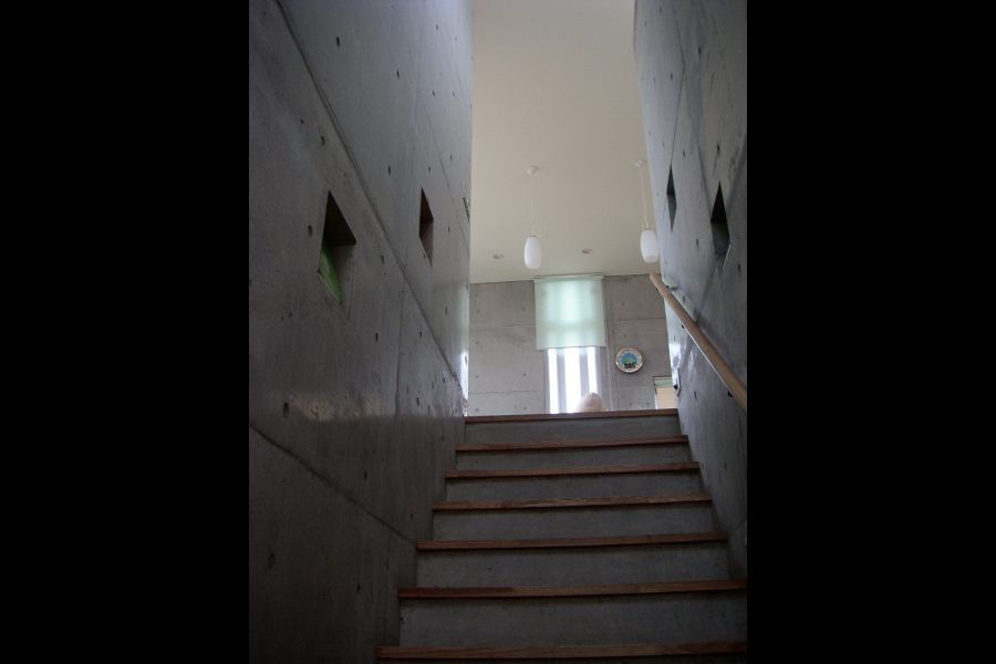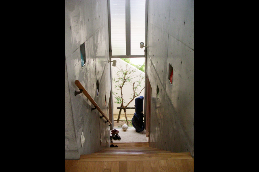 敷地に道路との高低差が約2.5m程ある土地でした。その段差を活かして、平屋的な感覚で生活しながら、プライベートも確保した計画となっています。
