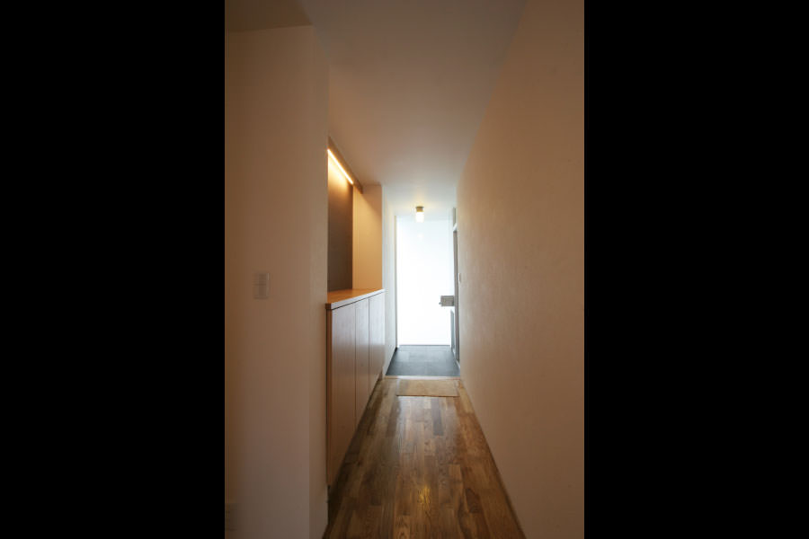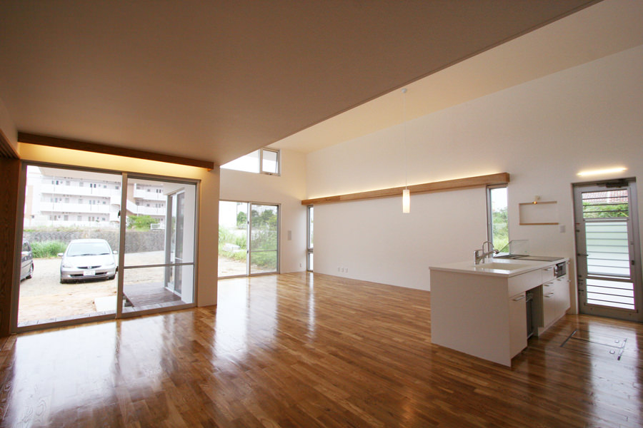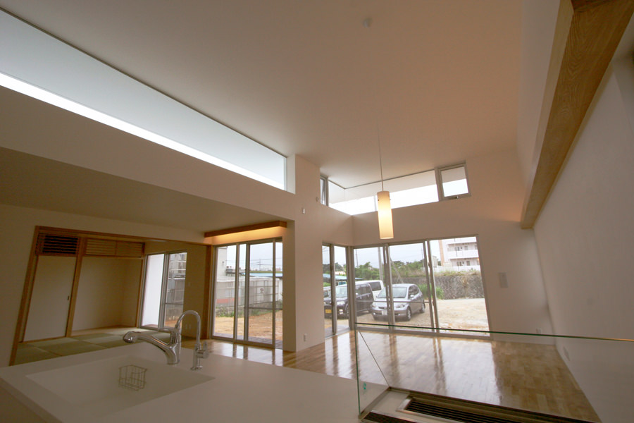 色々と土地の形状なども含めて考えてみた結果、背の高いボックスと背の低いボックスを組み合わせることを提案。東側隣地より得られる太陽の日差しを背の低いボックスの上から確保する立体的な計画を行うことで解決。お施主さまのご要望を踏まえ、ボックスの特徴と間取りをミックスすることで、プランが導かれました。その結果、住宅地でありながら、隣地の視線を気にせず、オープンな開口部を設けることができました。