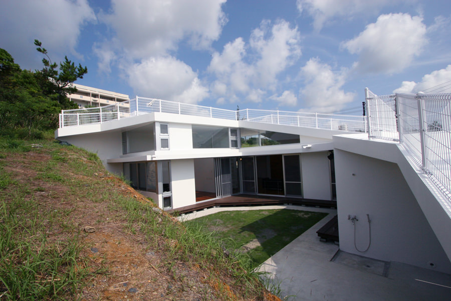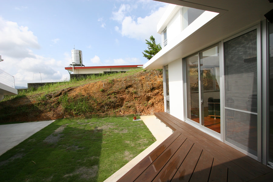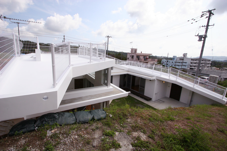 その時のインスピレーションのまま、計画が進んだことも特徴です。敷地環境から生まれる西日対策、敷地を活かすことで生まれるセキュリティ対策、豊かな生活空間。今回は、敷地の斜面等を利用して、屋根をぐるぐると歩き回れるように計画を行いました。屋根に上ると名護市一体が見渡せる絶景です。設計者が土地選びから一緒になって進めてきた事例としても面白い計画です。