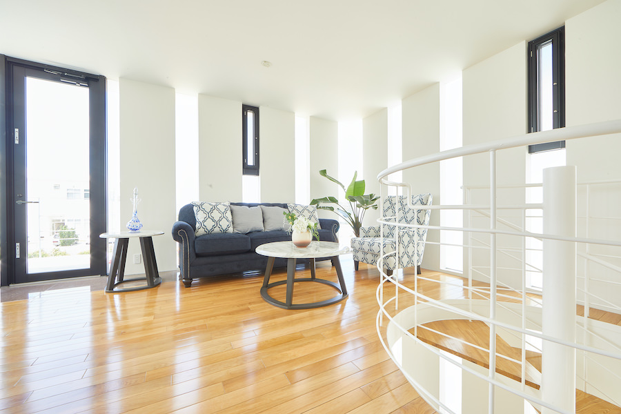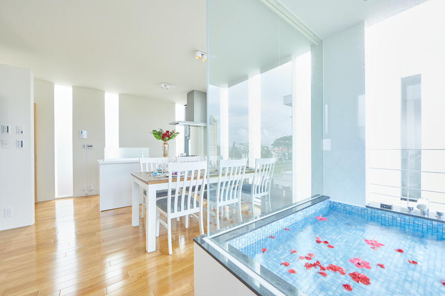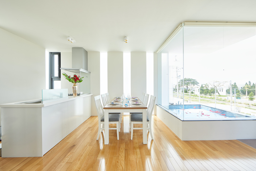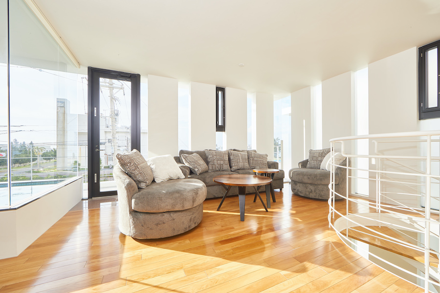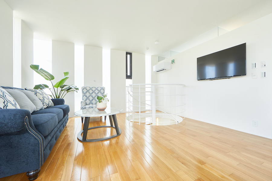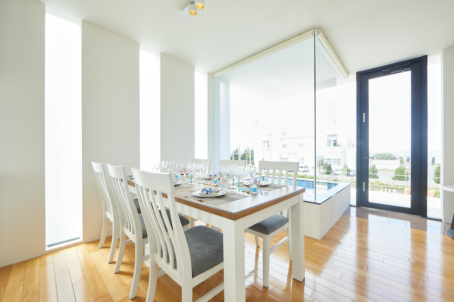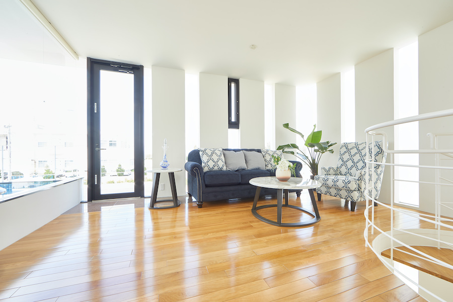 また、建物の構造が、パネル状の壁や床を組み合わせたようなシンプルな要素で構成されており、出っぱりのないスッキリとした構造デザインとすることで、外観からインテリアまで一貫したシンプルな建築デザインを可能にしております。
