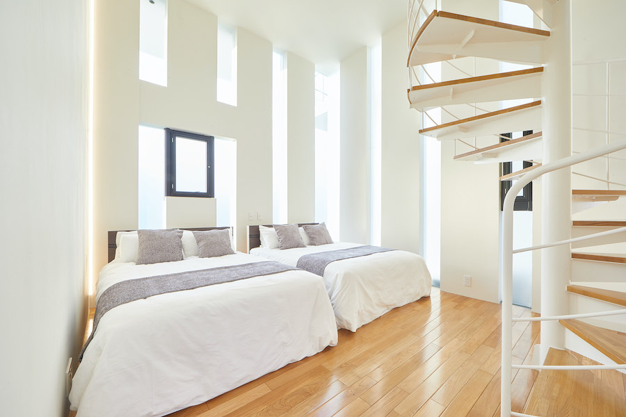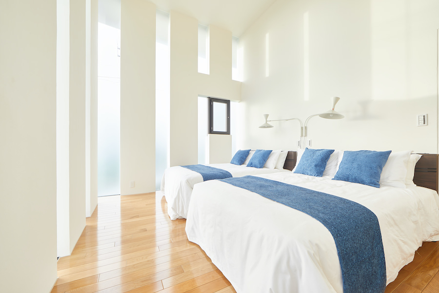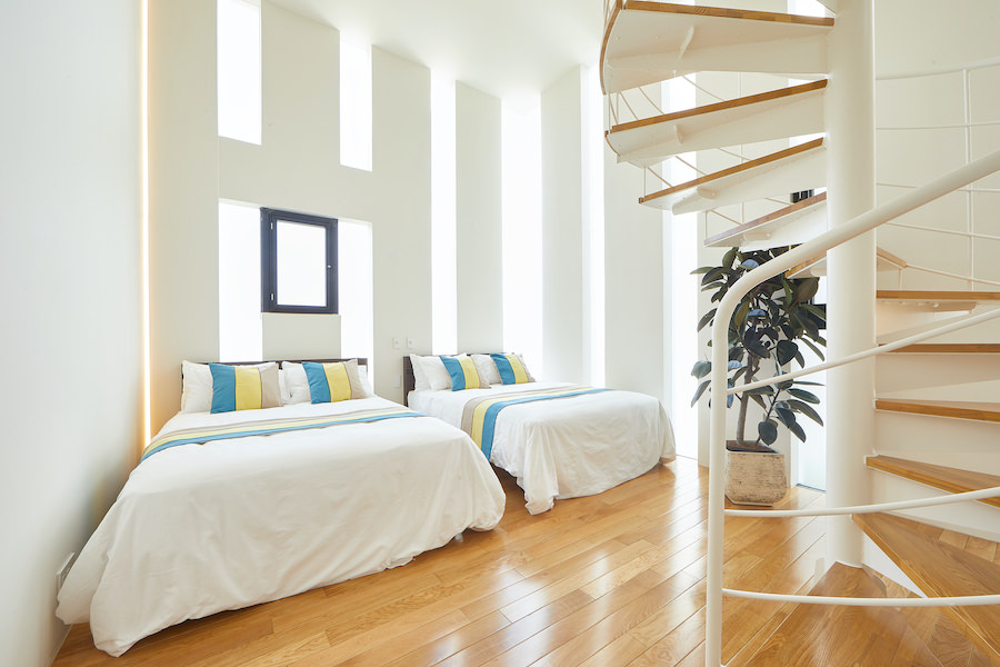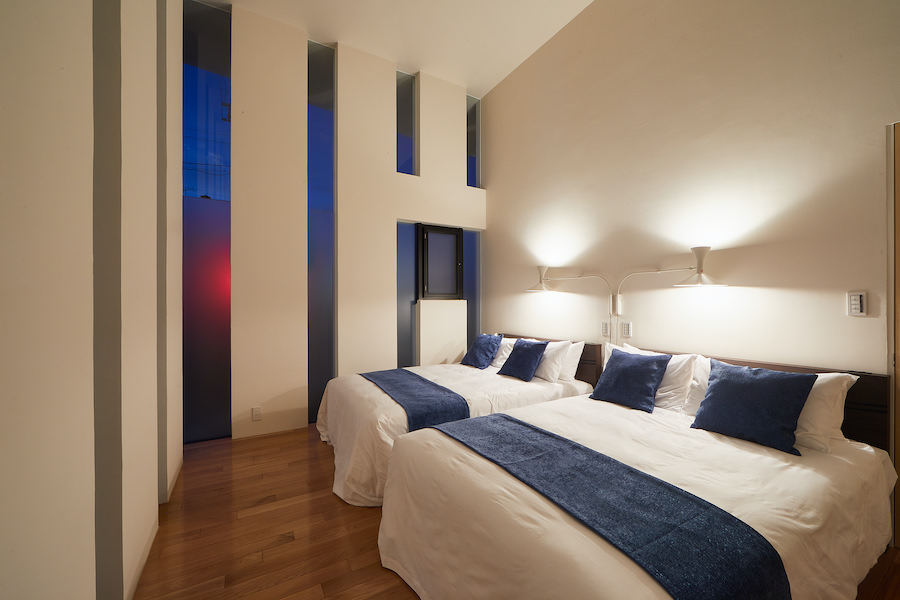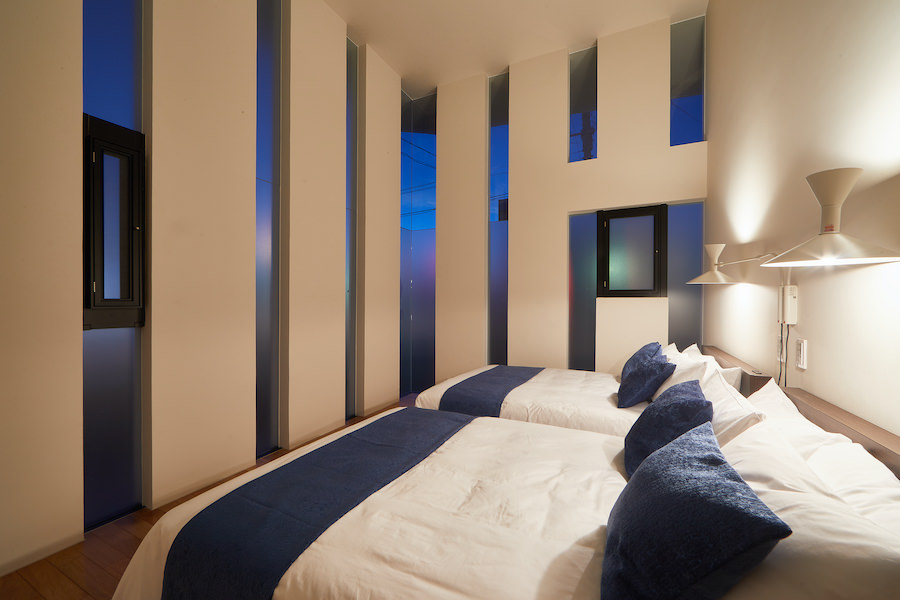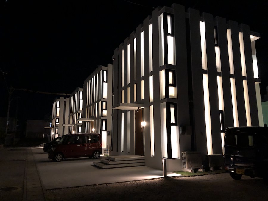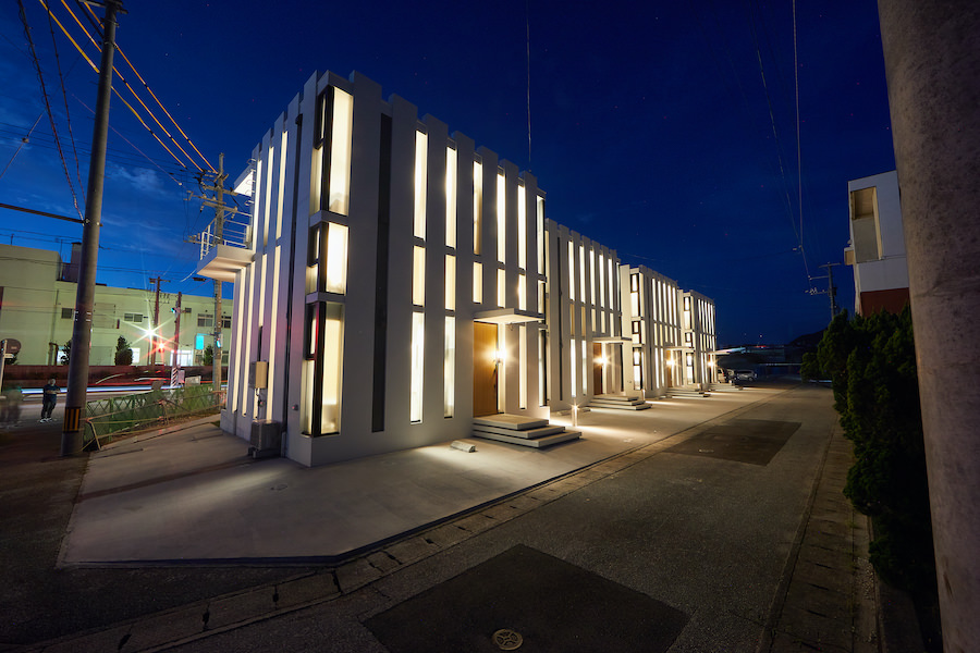 縦スリットが印象的な建物のデザイン。同じタイプの建物が、道路沿線上に建ち並ぶ建物群。単純に並ぶ建物で縦スリットが立ち並ぶことにより、建物群がインパクトを持った商業的な施設となりました。この特徴的な縦スリットは、屋内のインテリアにダイレクトに反映されて、宿泊施設として、日常では味わえない内部空間を実現しております。